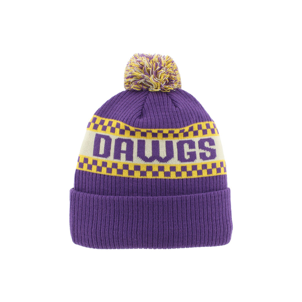 Zephyr Purple Gold Dawgs Checker Vault Dog Pom Beanie