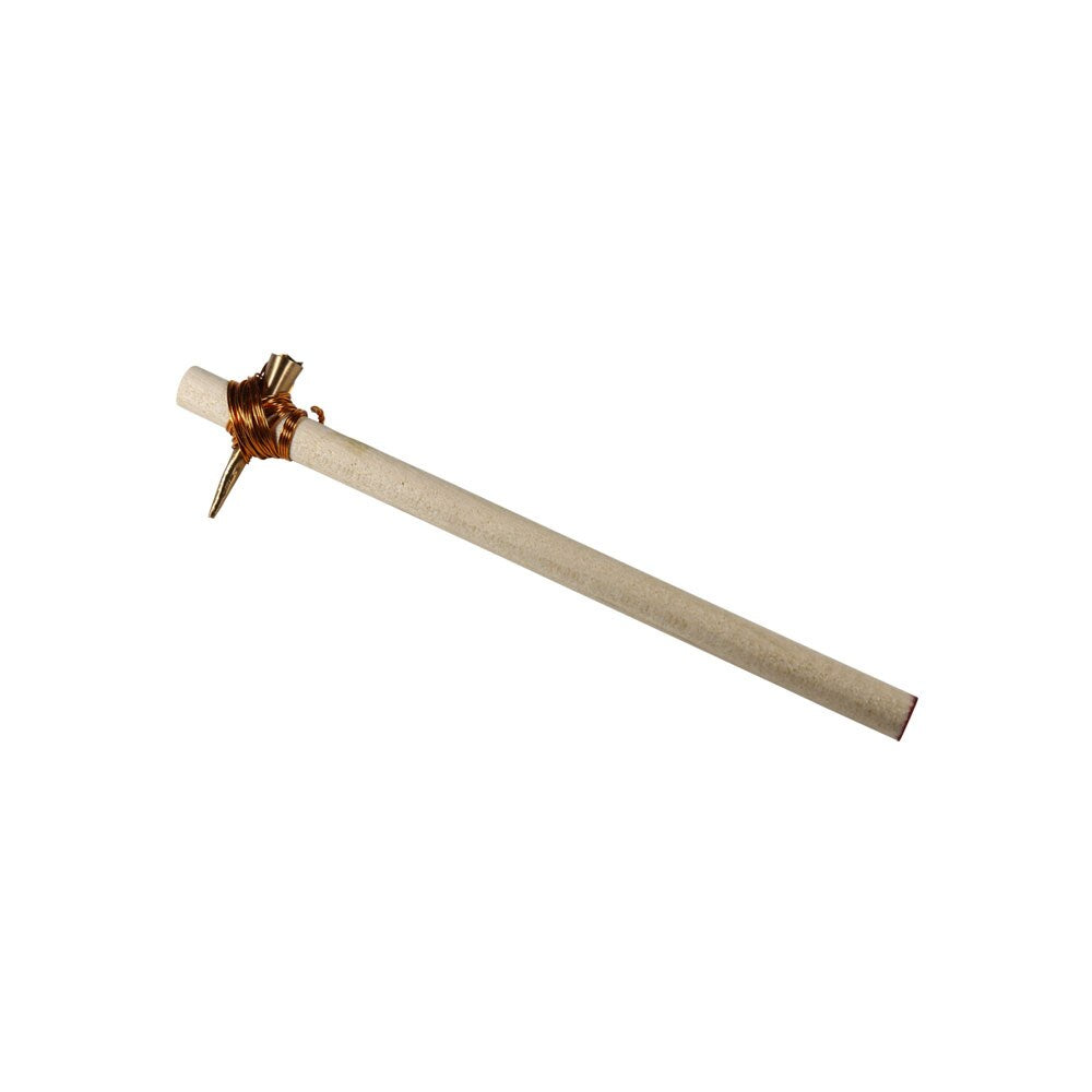 This heavy-tip tool is the traditional way to make pysanky, made from a handmade copper funnel, and secured onto a wooden handle with wire.