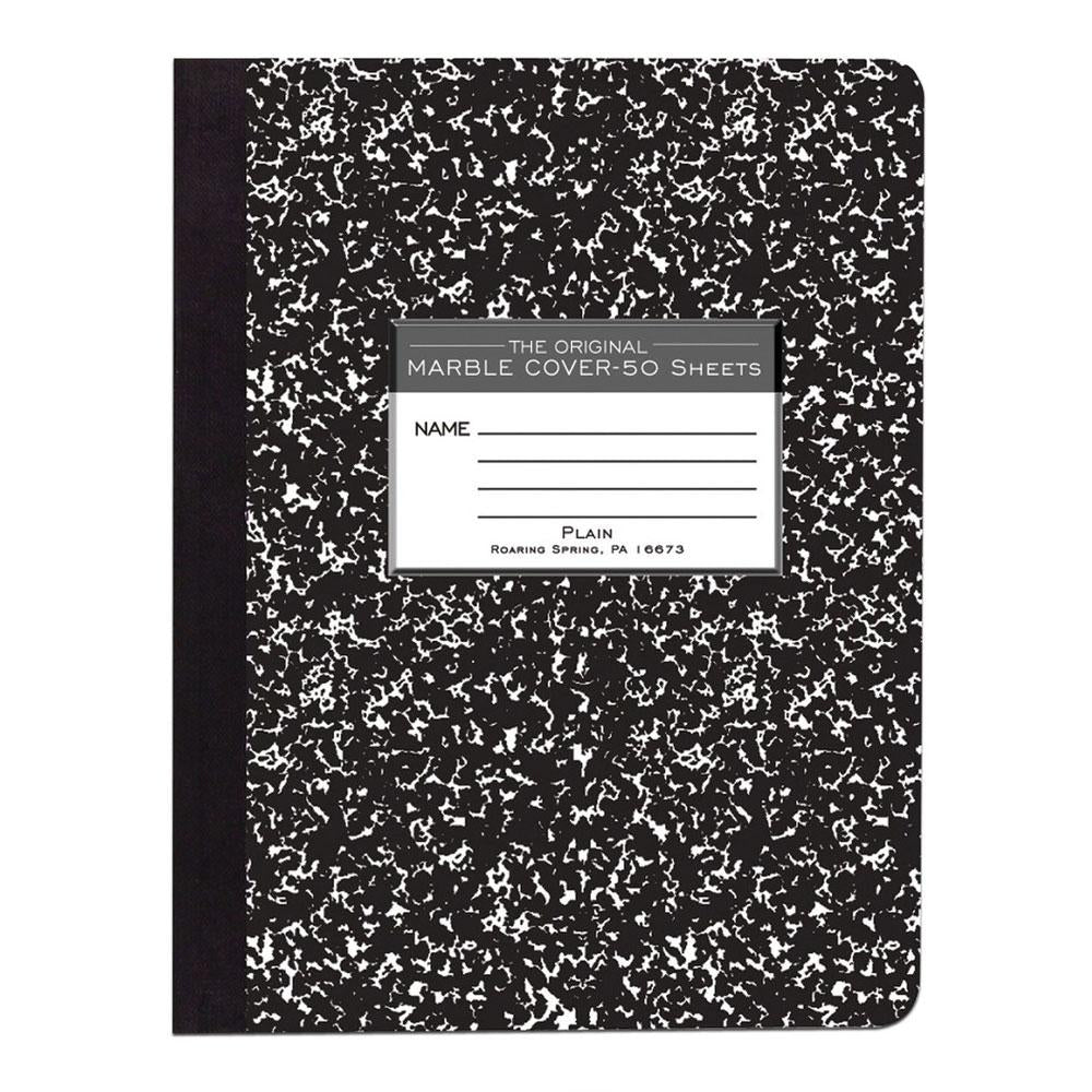 Record your notes in this permanently bound composition book. Paper is smooth 15# writing paper that is plain-no ruled lines of any kind-Great for sketches. Covers are a hard white board that are printed in the traditional black marble pattern. Inside of covers is printed with class schedule and other useful information. Each book is produced with center-sewn and tape bound construction, not designed for sheet tear-out. Sheet size is 9.75" x 7.5" and there are 50 sheets per book.
